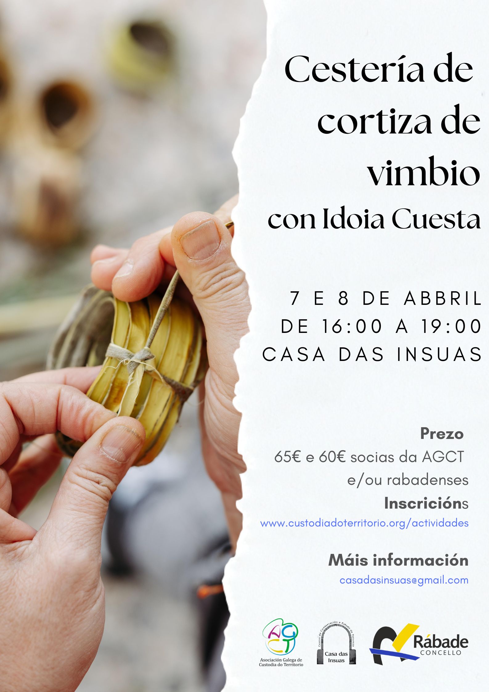 Hoxe queremos informarvos do próximo Curso de cestería con cortiza de vimbio, impartido por Idoia Cuesta. As persoas participantes aprenderán técnicas de traballo con cortiza de vimbio e poderán levar para casa as súas propias creacións.